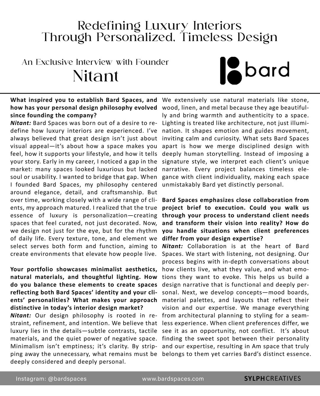Welcome to Bard Spaces, where classic elegance blends with modern functionality! With over 14 years of expertise and a diverse portfolio that encompasses luxurious homes and vibrant commercial properties, we are dedicated to crafting bespoke spaces that genuinely embody beauty, comfort, and purpose. Embark on this journey with us to turn your vision into breathtaking realities!